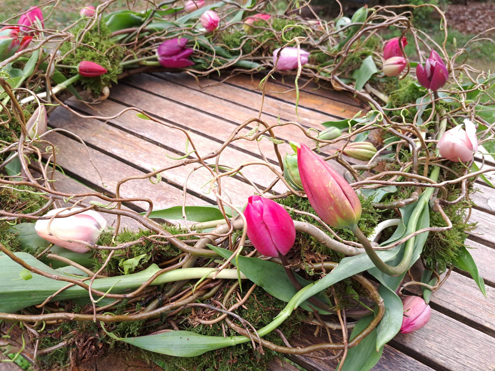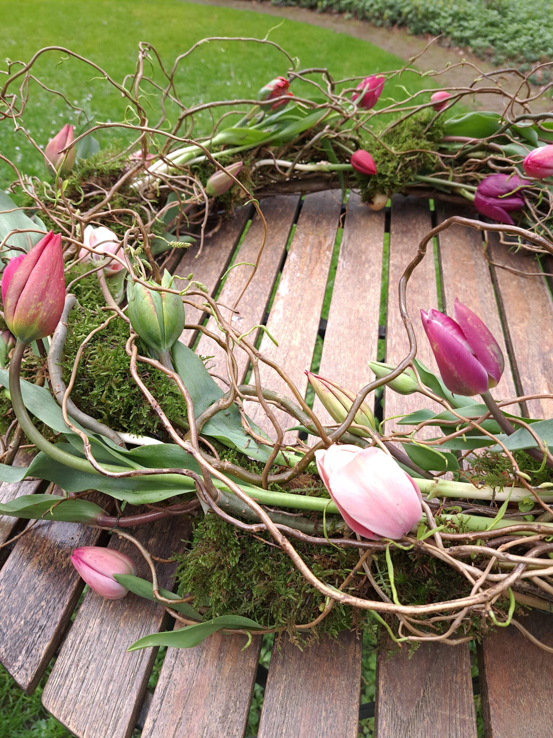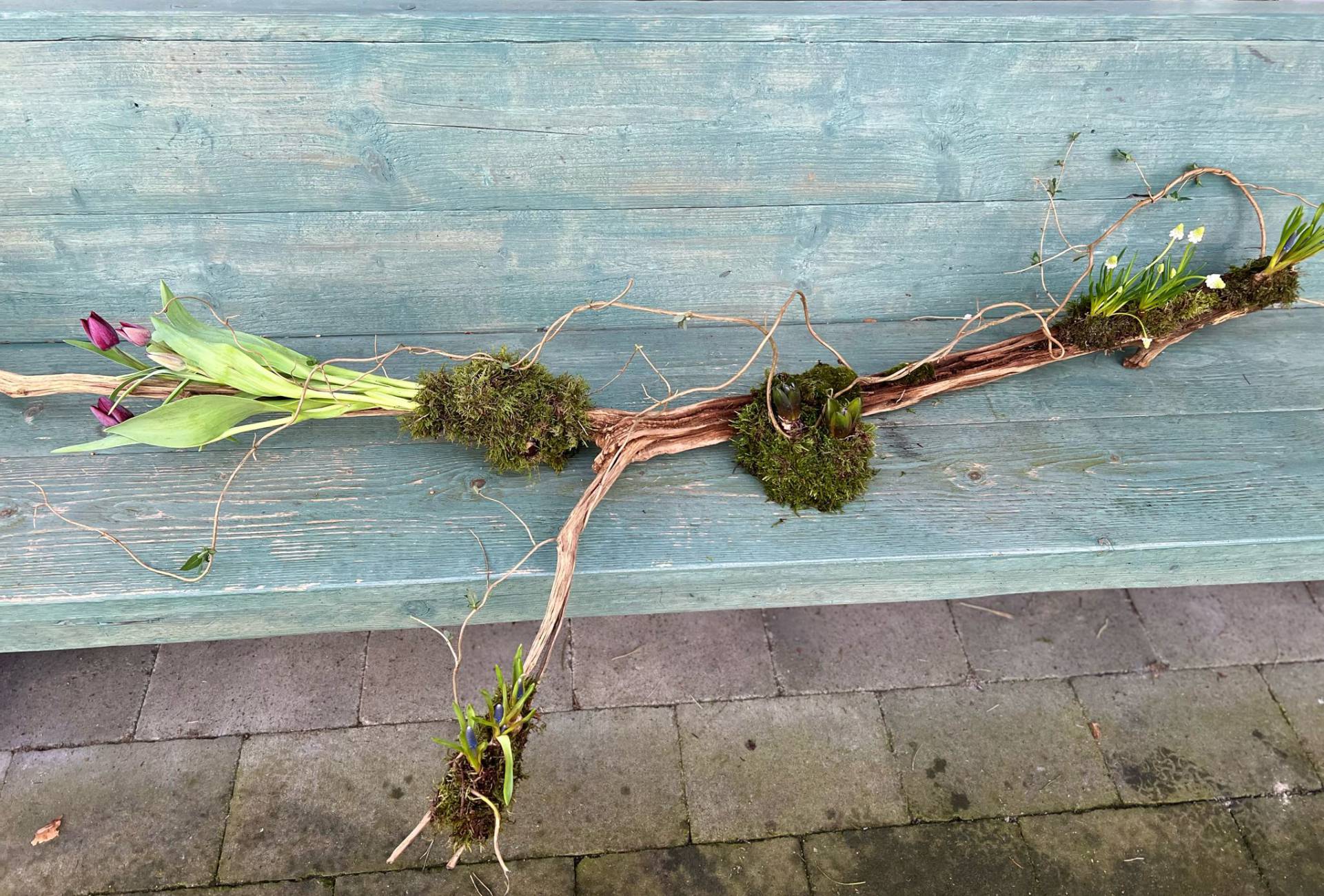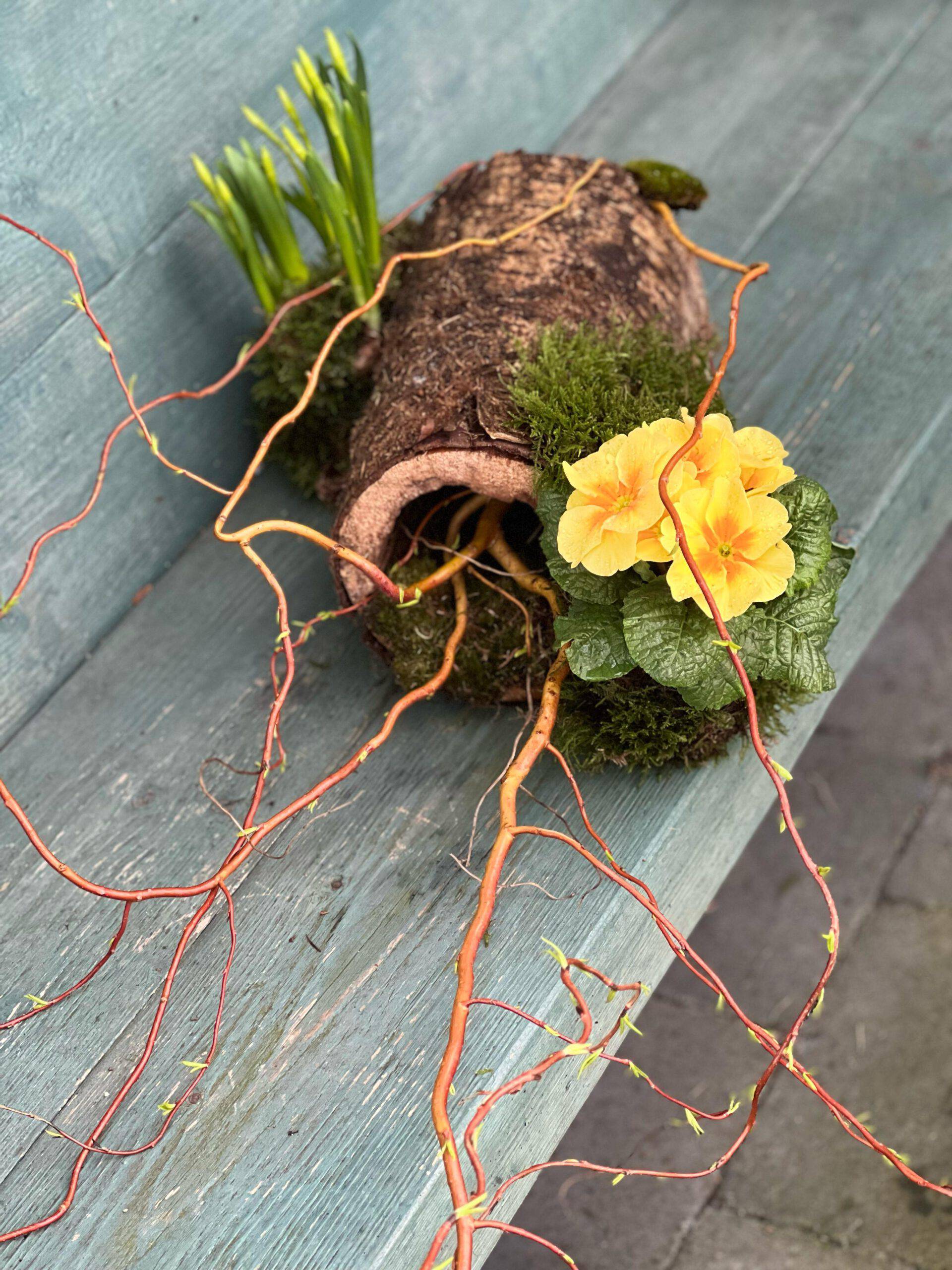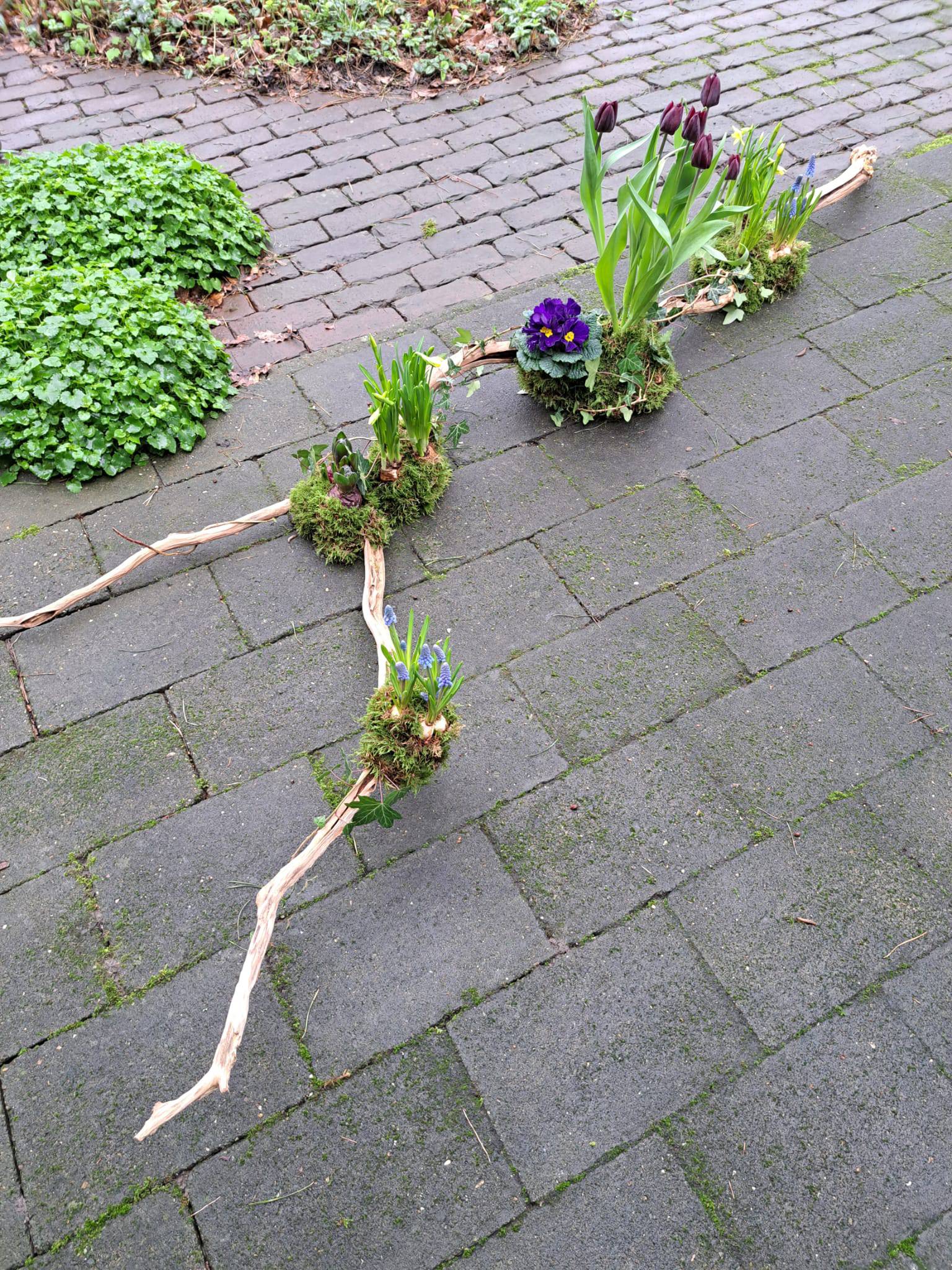 En vanzelfsprekend gebruik ik duurzame en afbreekbare materialen. Dus ondergronden van schors, hout, steen of glas en mos, klei, wol en bio oasis om de bloemen indien nodig in te verwerken.